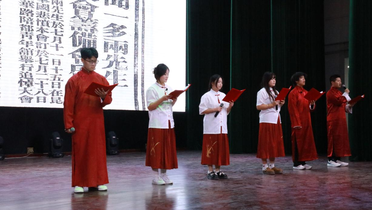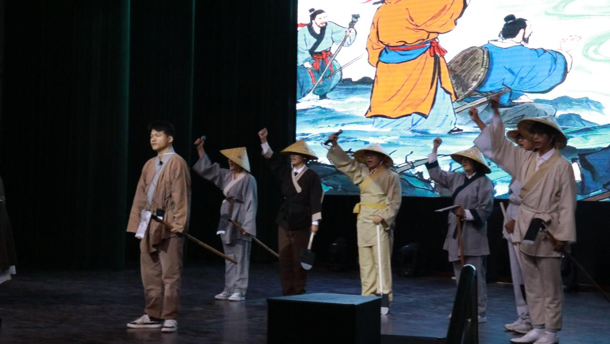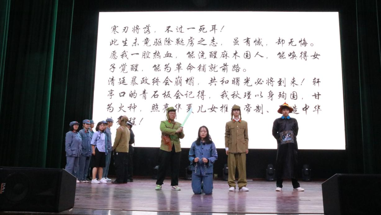 舞台之上,光影流转之间经典焕彩,声韵铿锵之处信仰生辉:《鉴湖女侠·烽火志》以肝胆豪情铺展革命先烈的报国长卷;《红色使命》用无声坚守镌刻地下工作者的信仰丰碑;《国歌》借热血旋律回溯民族危亡时的抗争岁月;《雪原上的丰碑》凭铁血忠魂礼赞杨靖宇将军的民族脊梁;《大禹治水》以千年担当传承先贤为民的济世初心;《百年沧桑》用深情诵读铺陈党的百年峥嵘征程;活动在《天地龙鳞》的恢弘旋律中圆满收官,演员们以精湛的演绎复刻历史场景,沉浸式体验引起在场师生们的共鸣。